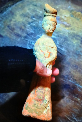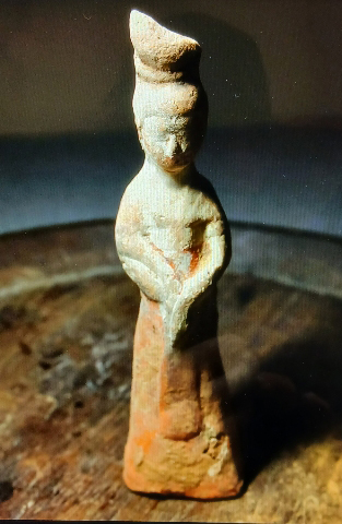 この作品を詳細に観察しますと、実は最盛期の唐の俑(俑とは人の殉死の代わりに考案された人形)というジャンルの作品をいい、それを観察しますと、美人俑では顔がふくよかで、まん丸です。いわゆる「唐美人」それを真似た「飛鳥美人」のように、丸くなりますが、今回の俑は細身でスマートな体つきをしてます。実はこれは唐の前時代の「隋(581~618年)様式」を踏襲した唐初期の作品なのです。