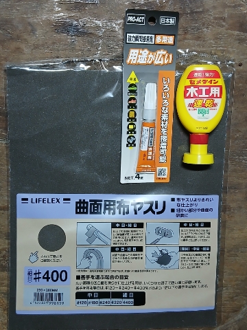 まず用意するものは、土器の修復ですから①水性木工ボンド ②サンドペーパー(#400番) ③瞬間接着剤(写真)の三点です。私はこの直し方を発見して以来、多くの縄文土器、ギリシャ彫刻、唐加彩作品を修理してきました。最初は少し練習、経験が必要かもしれませんが、私は高価な縄文土器をかなり細かく壊してしまった方から、3日間で元通りに修復して欲しいと懇願され、ぶっつけ本番で修復し、無事に傷が分からなく直した経験がありました。その時に経験を総動員して、様々な方法を考案しました。ですからいろいろ考えながらチャレンジしてみてください。