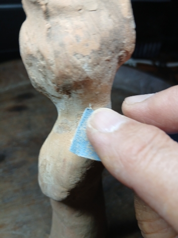 ②次に胴体の接地部分を少し紙ヤスリでけずり、赤土、白土の粉状の粉末を若干用意します。