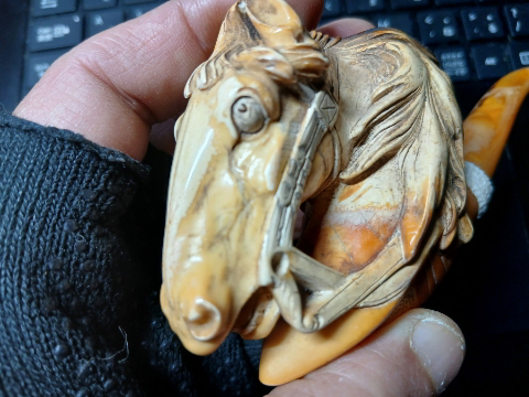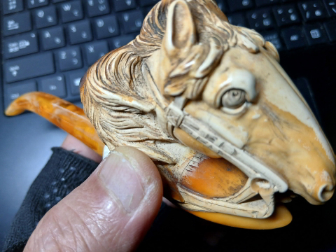 それと、今回の作品は同じ材質、Meerschaum(メシャム・ドイツ語でメーアシャウム、海の泡の意味。海泡石)のパイプです。素材であるメシャムは、日本では一般に軽い白い鉱物のことで、純白で美しく、原石を数十分水に浸しておくと、スポンジのように水分を吸って軟らかくなり、彫刻などがしやすくなるという特徴をもっています。メシャムは彫刻を施された後に乾燥すると再び硬くなるため非常に便利な素材なのです。その美しさと白い輝きから「白金の石」とも呼ばれます。通常は透明なワックスを2から3回掛けて光沢を出します。このワックスがタバコ燃焼時の熱でメシャムに溶け込み、喫煙時のヤニと共に作用して変色していき、長い期間喫い続けると透明度を増して、美しく濃い琥珀のような深い赤褐色の色合いをパイプに与えるのです。 これが本当に素晴らしくて美しく、私を魅了してやまないのです。