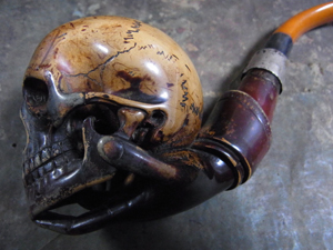 ヨリックの頭蓋骨を持つハムレットの手の使い込まれたメシャムパイプ