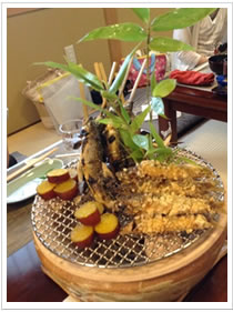旬彩料理・日野坂さか井(岐阜県岐阜市日野東8-2-16)の料理写真(アユの塩焼き・アユのおかき揚げ)