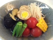 右の写真は九谷焼のスープカップに盛り付けました。いろいろ工夫してみましょう。