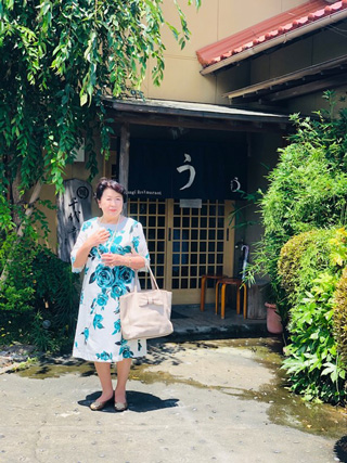 岐阜県美濃加茂市にある「かも川茶寮 うを完」前の筆者