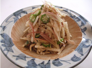 - 大根は皮をむき、3cm長さで4mm幅位の短いせん切りにします(せん切り器を使用すると手軽にできます)。
