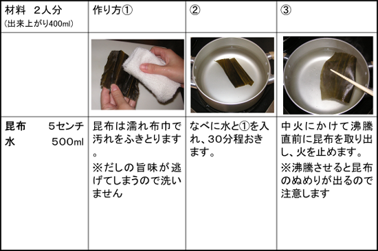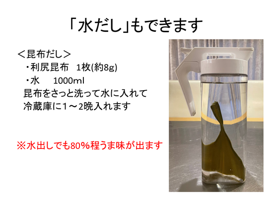 - 「昆布出汁」はミネラルが豊富で、鉄、カルシウム、ナトリウム、カリウムをバランスよく含んでいます。