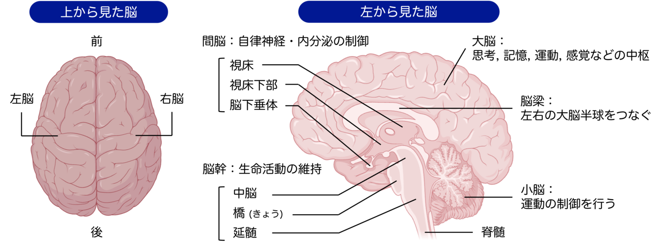 脳は、全身の司令塔として情報を処理し、身体のさまざまな機能を調節しています。脳の80%を占める大脳、頭の後ろ下方にある小脳、脳の中心にあり左右の大脳半球の間に位置する間脳、脊髄へとつながる脳幹に大きく分けられます。間脳は視床、視床下部、脳下垂体、脳幹は中脳、橋(きょう)、延髄で構成されます(図1)。