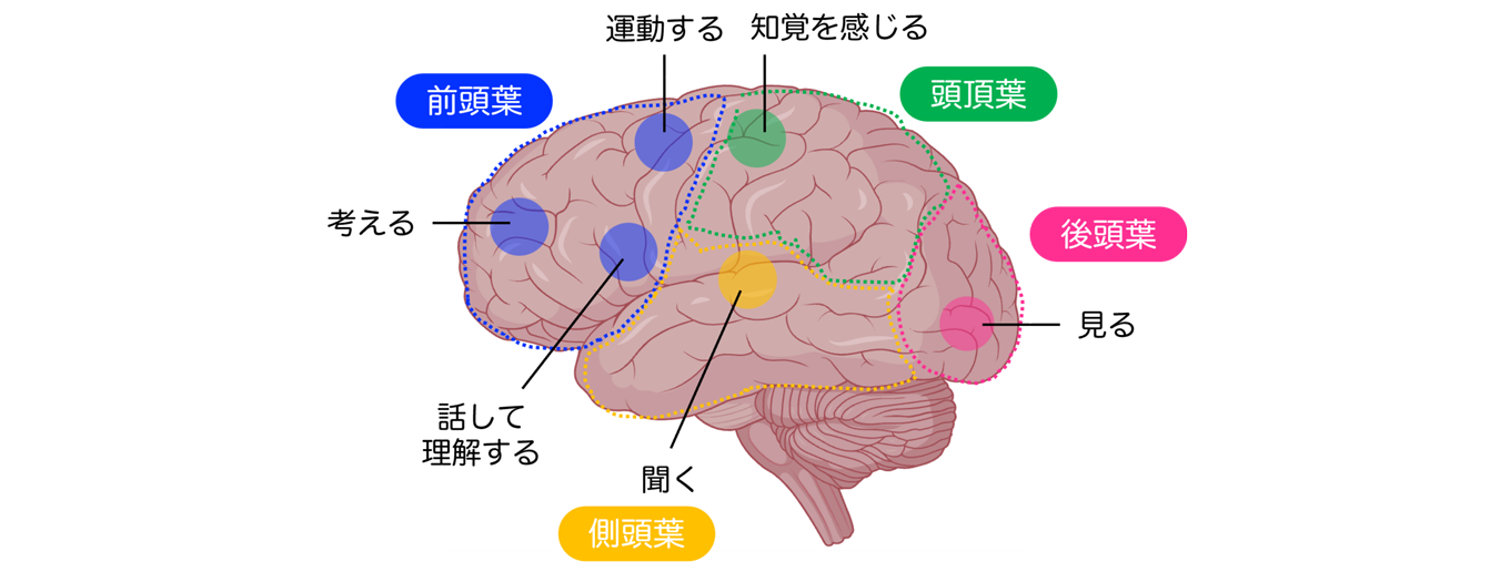 大脳皮質は、前頭葉、側頭葉、頭頂葉、後頭葉に分かれ、領域によって、思考、記憶、判断、感情、感覚、運動などの異なる処理を行っています(図2)。