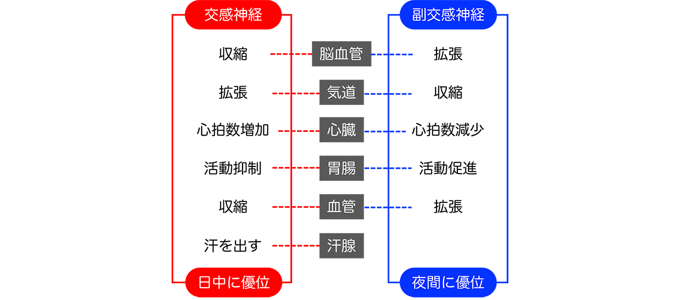 自律神経には、交感神経と副交感神経の2種類が存在する。交感神経は、体内を興奮・緊張状態にし、活発化する一方、副交感神経は体内を安静化させる。両者はバランスを保ちながらはたらいている。