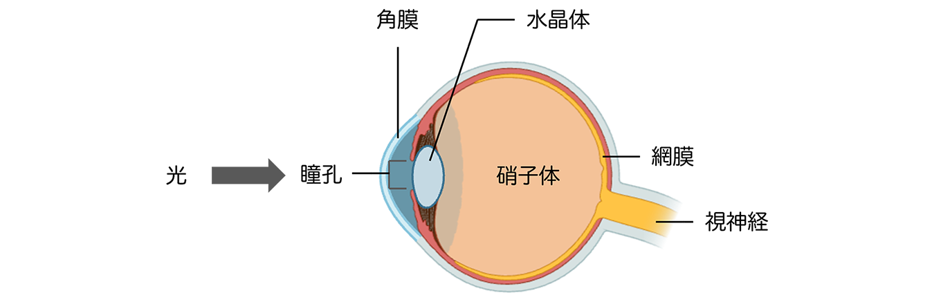 光は、角膜、瞳孔(どうこう)、水晶体を通過して網膜に当たる。情報が、視神経を通って大脳に伝達されることにより、ものが見える。