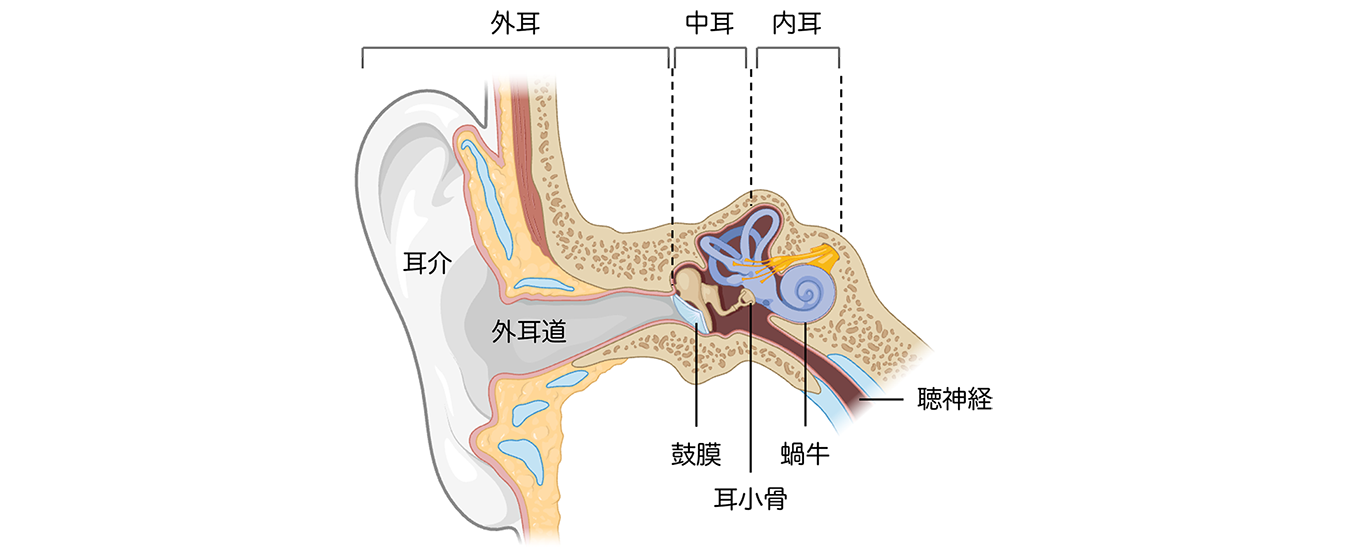 耳は、外耳、中耳、内耳に分けられる。音は、外耳道を通って鼓膜を振動させ、中地にある耳小骨、蝸牛を介して聴神経を通って大脳に伝達されることにより、音が聞こえる。