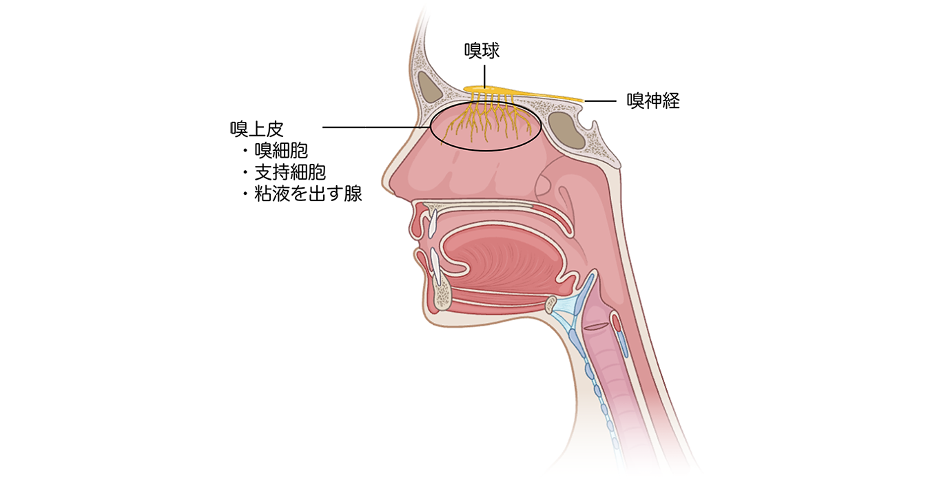 鼻腔の天井にある嗅上皮では嗅細胞によって匂いが捉えられ、大脳に伝達されることにより、匂いを感じる。