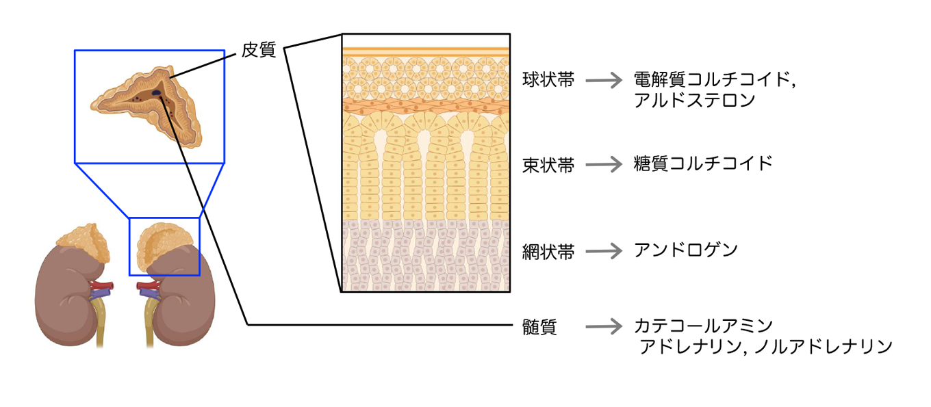 副腎は、皮質と髄質に分けられ、皮質からは電解質コルチコイド、糖質コルチコイド、アンドロゲンが、髄質からはカテコールアミンが産生・分泌される。