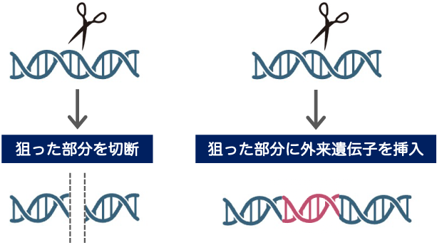 ゲノム編集により、目的とするDNA配列を切断し、遺伝子を切断することによって機能を喪失させることができる(左)。また、狙った場所を切断した後に、外来遺伝子(赤部分)を挿入して、新たに機能や性質を獲得させることもできる(右)。