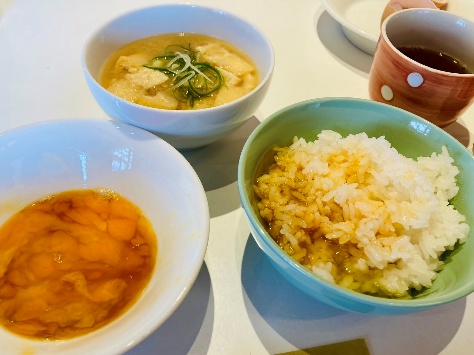 お昼は先生のレストランで卵ご飯と豚汁で