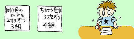 ①「同じ色のカードを2枚ずつ3組」「ちがう色を3枚ずつ4組」など1枚の紙に1つずつ指令を書きます。