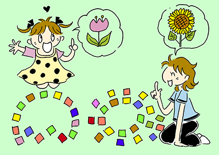 ①1人20枚ずつ(色に関係なく)の色カードで、好きな「花」をつくります。