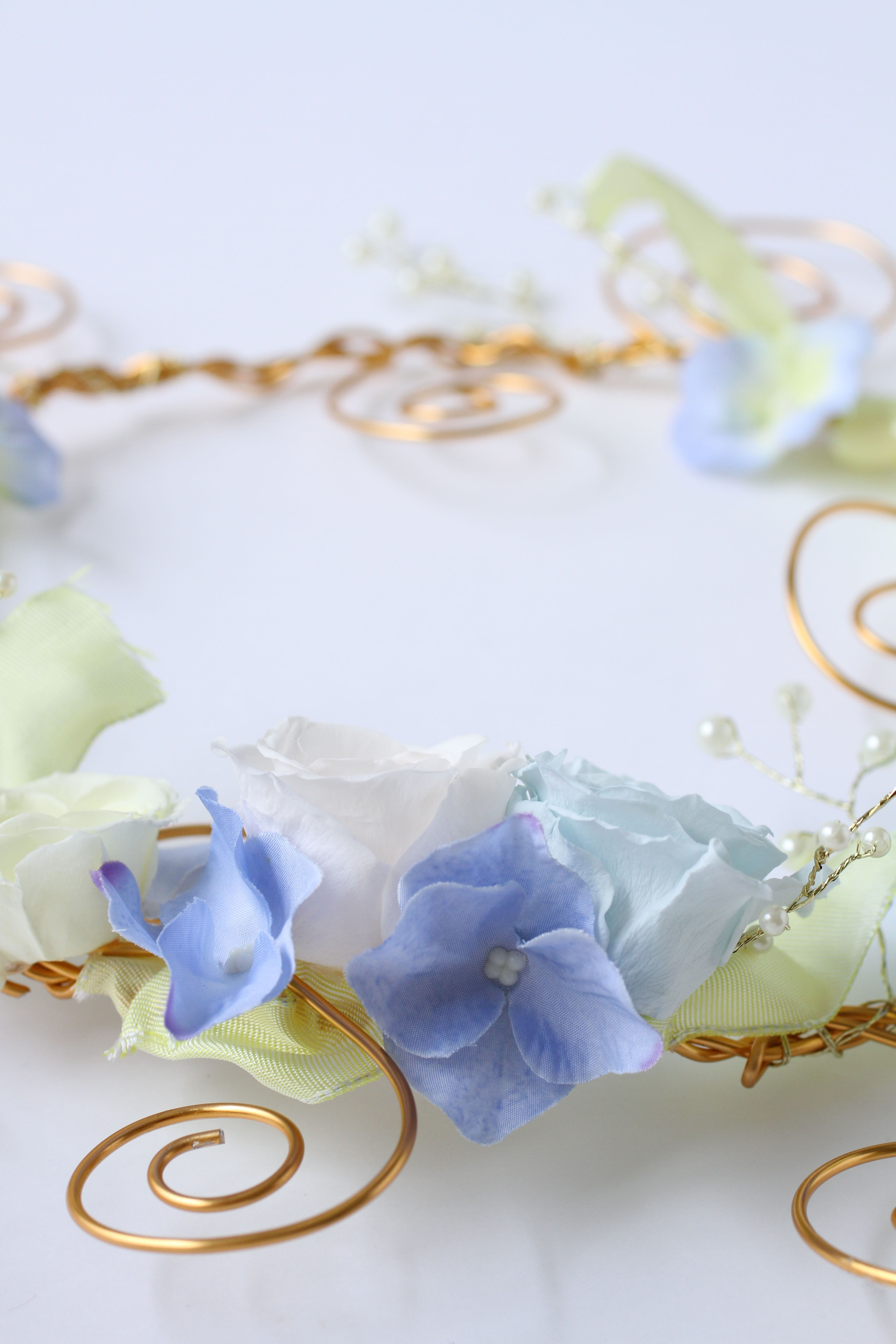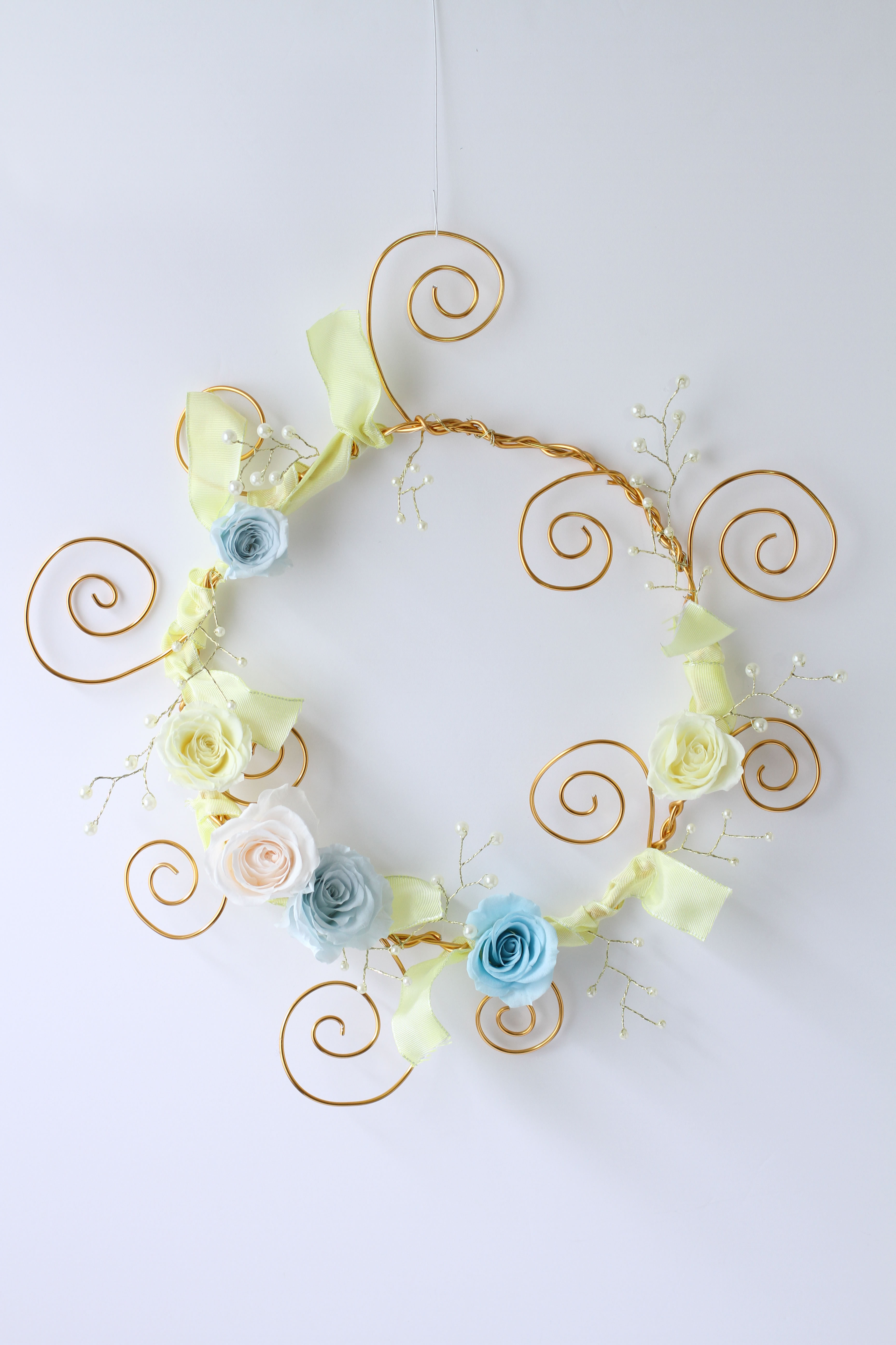 土台のゴールドのワイヤーも所々見せながら、また、まったくアレンジしない場所も円周の1/4くらいつくり、リボンをまいていきます。