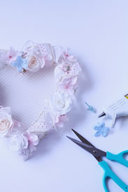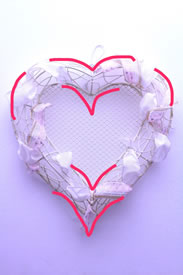 - #20ワイヤーを糸を縫うときの針のような要領で、リボンを通して、ハートリース台の網目の穴を所々くぐらせる。(リボンはアレンジの最後のほうの調整用として、少し切り分けてとり置いておく)