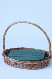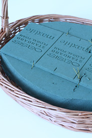 オアシス1ブリックの厚みを半分にカットして、1片はカゴの中央に。残り半片はかごの隙間を埋めるようにカットしてセットする。