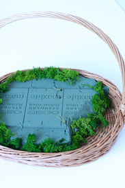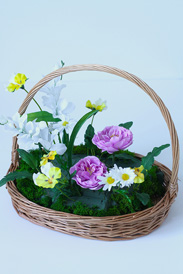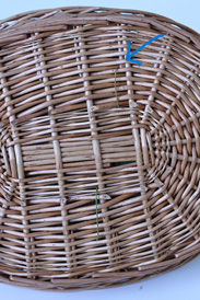 編み目に隙間があいているカゴの場合のオアシスのセットは、そのカゴの底面裏から編み目の隙間2箇所にワイヤーを通して、オアシスを貫通させ、オアシス上面でワイヤーを捻り、固定させる。