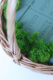 オアシスの縁に、Uピン(#20ワイヤーグリーン)でモスを固定アレンジする。