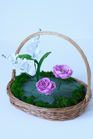 - 今回はアーティフィシャルフラワーの茎を適切な長さにカットして、直接オアシスに挿してアレンジしました。(もし弱い茎、短い茎などで補強やステム作成の場合は、#22ワイヤー(緑)でツイスティングメソッド、テーピングを行う)