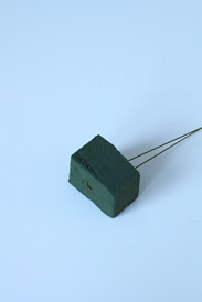 - うさぎのオーナメントは少し高さを出すために、オアシスをカットして小さな台を作り、そこに#20ワイヤー(緑)のUピンを挿した状態にして、器のオアシスに挿し、設定する。