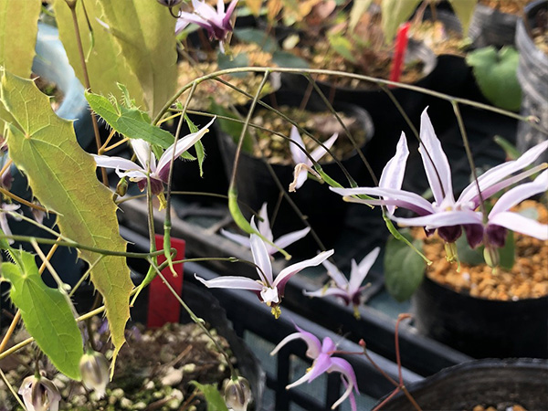 イカリソウは、メギ科の多年草で、本州、四国、九州の山地の林床に分布しています。船の錨のような変わった形の花を咲かせます。花色は白色から濃いピンク色です。最近は中国やロシアの黄色や濃い藤色の花もあり、交雑種も容易に出来る事から、色々な花が作出されています。春の山草の中では、雪割草と並んで人気があり特に大株にしますと大変豪華になります。株分けは、花後から秋までに行いましょう。