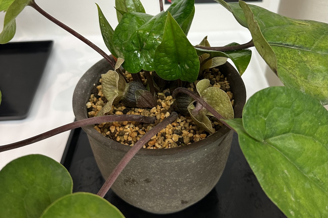 江戸時代(天保の頃)には、細辛(さいしん)と呼んで、葉変わりの栽培がブームになり、沢山の変化葉が見つけられました。野生のカンアオイは、通常茎に赤紫の色が付いています。細辛は、野生種の中から、茎の緑の個体を選別し園芸化された物です。植物学的には、同じカンアオイですが、長い年月の間に交配もされていますので、野生種とは全く違った園芸種です。