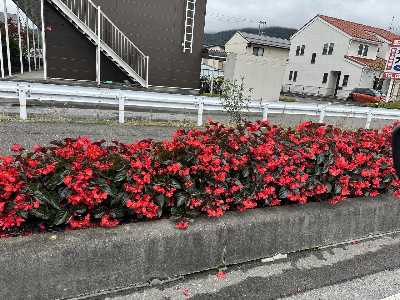 昨年も、気になりましたが幹線道路で停まれず気になっていました。車が走っているので、いったい何かわからず、40~50cmの赤い花が咲く花木は何だろうと不思議でした。ベゴニアに思えましたが、寒い長野県で、通常のベゴニアの大きさでは無いので、余計混乱しました。今年も同じように、植栽されて赤いベルトになっていました。虫仲間の車に同乗でしたので停まってもらおうかと思っていましたら、ちょうど信号待ちで見ましたら、ベゴニアでした。冬には枯れるので毎年植栽しているのですね。少し手間がかかりますが、名古屋でも植えてほしいと思いました。苗を冬越しすれば、毎年咲かせられますね。