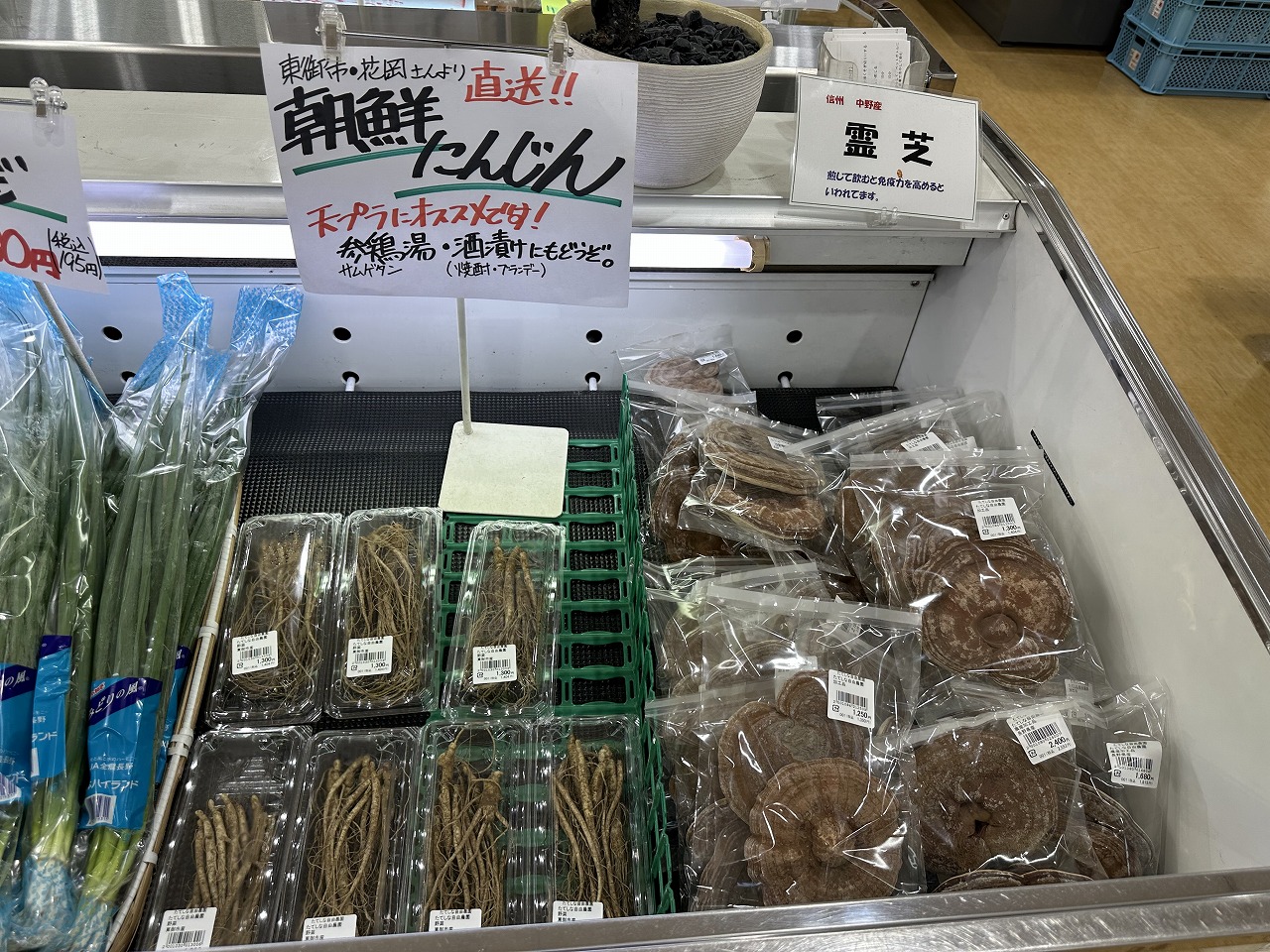 朝鮮人参や霊芝、売れるのかと思っていたら、カゴに入れている方がいました。霊芝はどうやって食べるのかな。