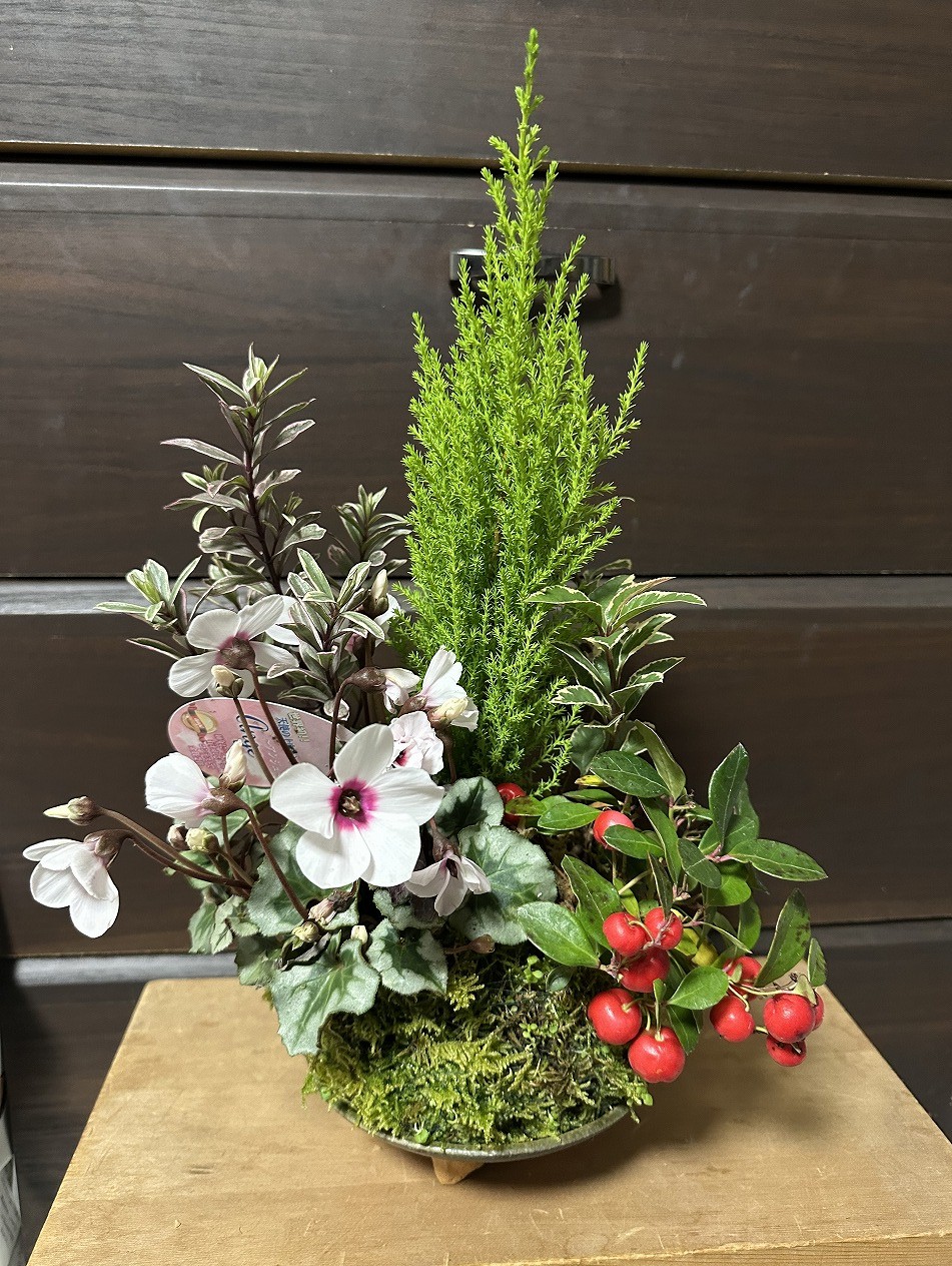 上向きに咲くシクラメン「アンジュ」、へーべ「アイスイザベラ」、チェッカーベリー、ヤブコウジ斑入り、コニファー「ゴールドクレスト」