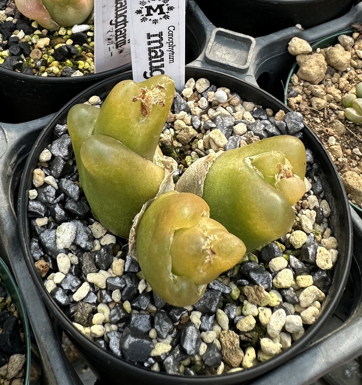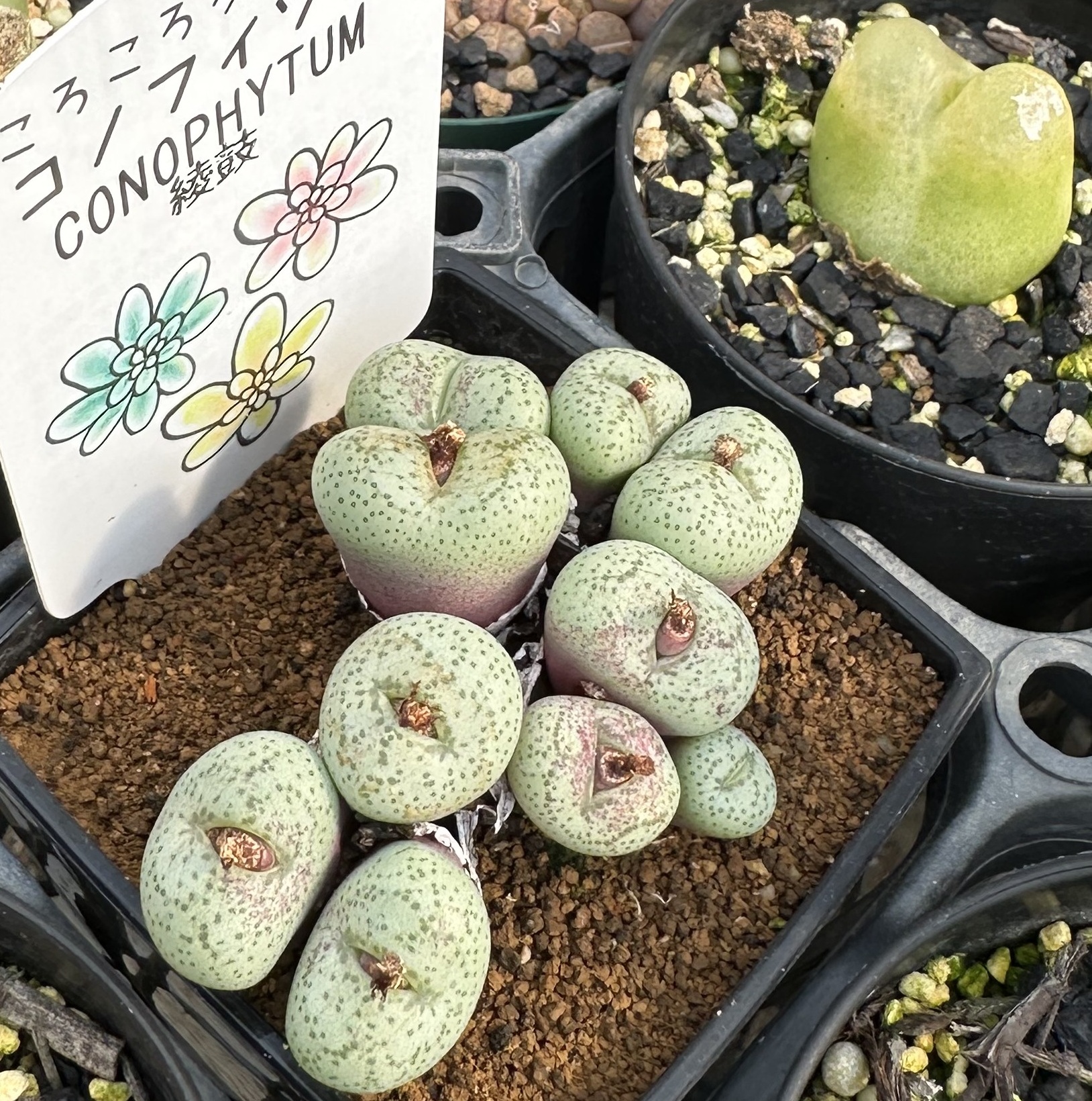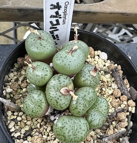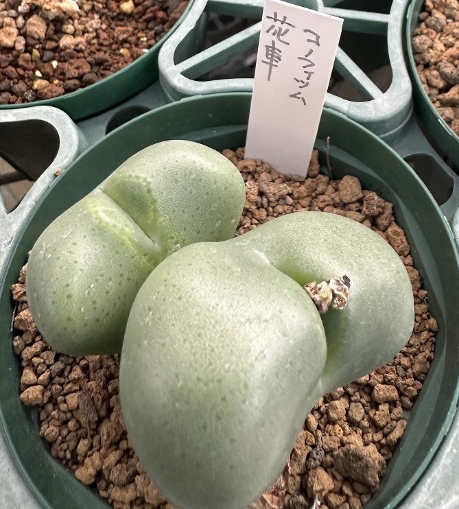 私が多肉植物に興味を持ち栽培し始めたのは、ハオルチアでした。その当時コノフィツムはリトープスと同じ様に見えて、あまり気にしていませんでした。先日、知人の多肉植物の農園を訪ねました所、リトープスのブルゲリを見て大変驚きました。それは人工的な作り物のようで、表面も柔らかくお菓子のグミみたいでした。