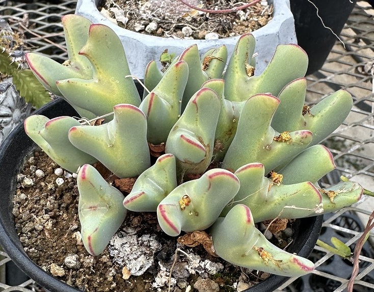 夏の休眠期には水を切り風通しの良い日蔭に置きます。コノフィツムは同じメセンの仲間のリトープスと同様に、休眠に入る前に外側の葉が枯れてそれが、かさぶたの様になり休眠期をします。秋には新しい葉があたかも脱皮をしたように出現します。冬は5℃を切らないような所に置き、3~4時間は日に当てましょう。