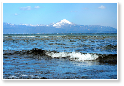 琵琶湖の湖西方面から見える伊吹山です。お天気が良いと遠方までくっきりと見え琵琶湖の大きさがよく分かります。湖岸に打ち寄せる波が淡海を感じさせます。