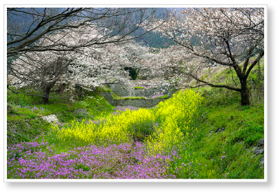 養老山地が連なる岐阜県南濃町での桜とからし菜の花などの春の花のコラボレーションです。その年のタイミングが合わないと撮れない光景です。この奥には出来山の千本桜の名所があります。