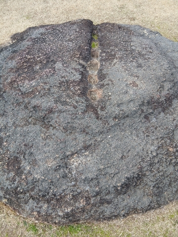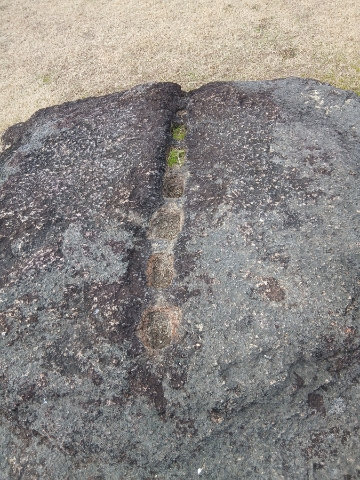 事実皆さんが西塔の礎石をご覧になると、幾つかの穴が表面の真ん中に打ち込まれていることが見て取れます。この穴はもともと自然に出来たものではなく、古墳時代からあると考えられる採石技術「矢穴」として職人に伝わってきた「石切(石割)技術」の一種なのです。こうして石に等間隔に四角い穴を開けて、割れやすくする「穴」を深く入れてから、そこに楔を打ち込みます。この「大安寺」の塔礎石は大きすぎたようで、見えない下部も大きく、しかも硬いため、到底割ることができなく、諦めたようで、そのまま残りました。