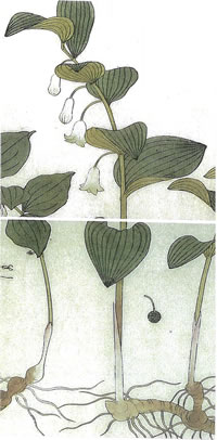 その揺らぐ姿美を、江戸時代の『本草図譜』でも「葳蕤(えみぐさ)」と記され、懸け垂れる可憐な花に赤味ある茎と茎根の姿を図版[I]で参照してみて下さい。また、薬用植物として、根茎を乾燥させ煎服すると「強壮剤」に、摺り潰した汁は「打撲症、腰痛」に効があるとされております。