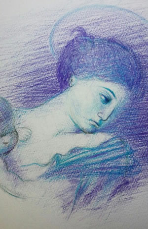 イラスト:カラヴァッジョCaravaggio(本名Michelangelo Merisi 1571-1610)の作品「ロレートの聖母」(Madonna dei Pellegrini):聖母マリアは画家の恋人、娼婦マッダレーナと考えられる。聖母の表現を生きるひとりの人間のモデルとした当時最も話題性に富んだ傑作。(樋口佳代)