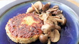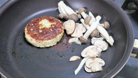 同じく冷凍の豆腐ハンバーグを焼いている横で、出来上がる3分ほど前にシメジとマッシュルームを投入しました。