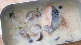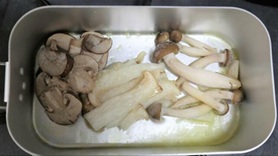 まずはバターを熱してエリンギ、ブラウンマッシュルーム、シメジを凍ったまま炒めます。途中で塩コショウを追加。あとは豆乳とコンソメスープの素、鮭を入れて煮込むだけ。