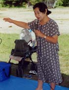 | 12:50~ | 東濃地方の民話語り語り部/三戸律子さん 木仏と金仏が相撲を取った話、サトイモの葉っぱをオオカミと間違えた話など、10の民話をたっぷり40分。そよそよとテントの中を心地よい風が吹き抜ける中、お母さんの腕に抱かれて聴く子どもたち、横になってうとうとするお父さん。ゆったりとした里山の時間が流れていた。