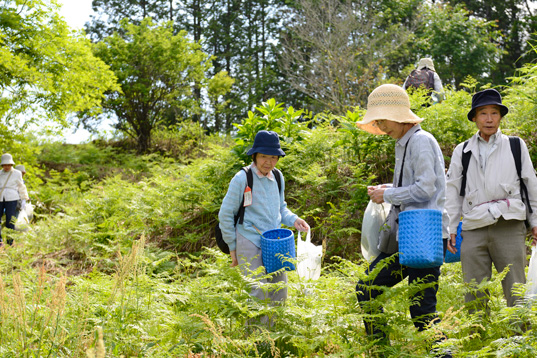 大半の参加者が楽しみにしていたワラビ採り。昔を思い出して探す人、ワラビの根っこから葉っぱの先までの長さを競うコンテストに向けて長いワラビを探す人。初めて体験するという人は、まずワラビってどんなのを採ったらいいの?どこから折ったらいいの?と少々戸惑いもあったが、すぐマスターして袋にいっぱい!